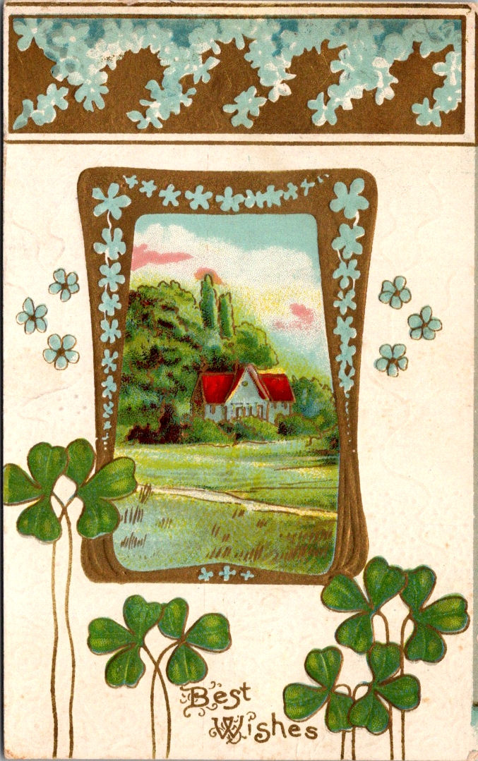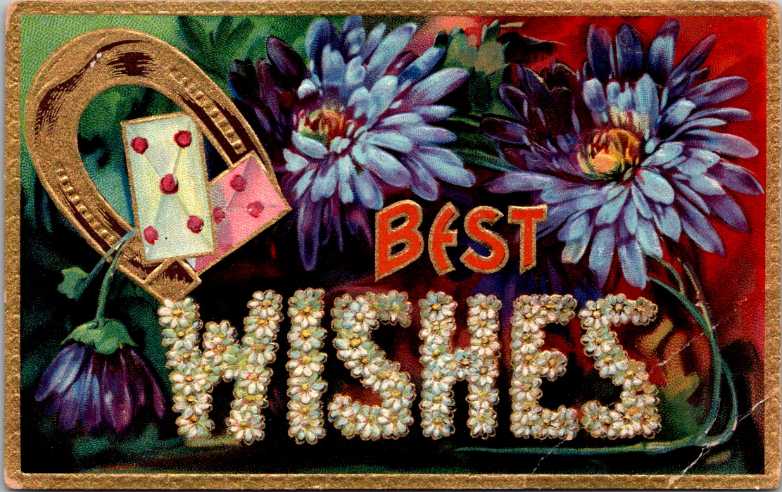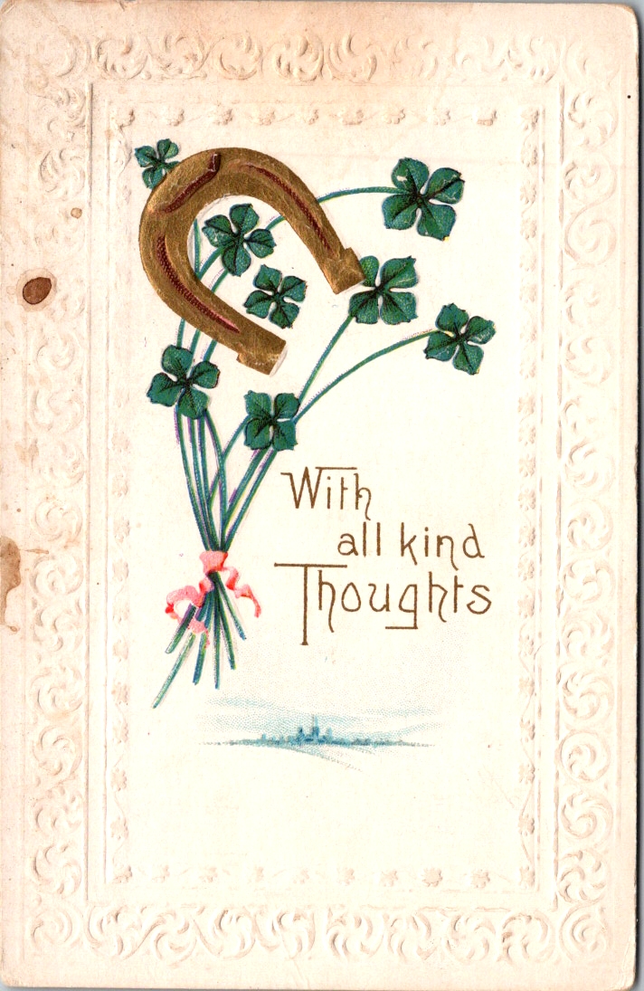 Edwardian postcards had a curious set of symbols to call forth fate and fortune. Horseshoes, shamrocks, roses, and playing cards. Small and slightly worn at the edges, these vintage greeting postcards have traveled more than a century carrying a providential wish.