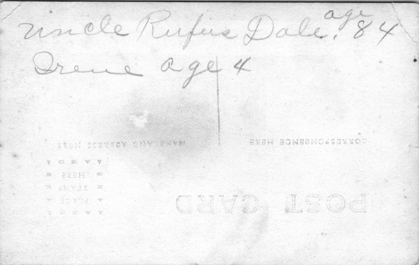 Back details: The reverse shows the handwritten inscription in pencil, Uncle Rufus Dale, age 84 and Irene age 4. We can assume a family relationship, likely between grand-uncle and grand-niece.