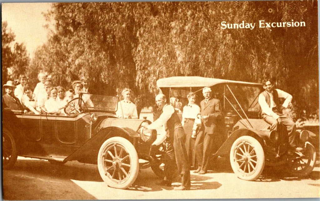 The card from John Horsman’s Chevron station showed a 1908 Benz. Drew Ford in La Mesa sent another with a 1911 Coey Flyer. On the back: a service reminder. Your oil is due. Come in soon.
