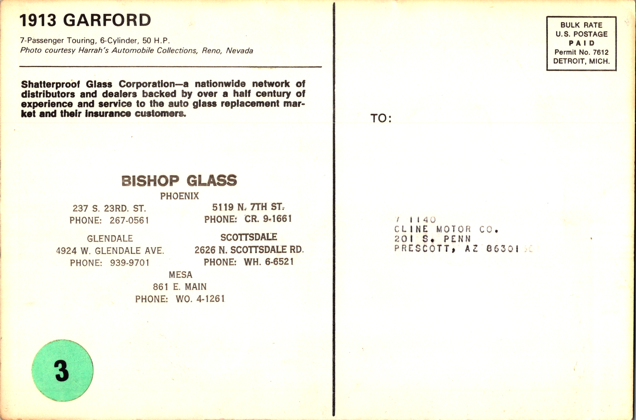 The Harrah’s postcards in this set were produced from his collection’s photographs, shot when the restoration program was at its height. A glass company in Detroit printed them. An auto glass distributor in Phoenix mailed them to customers in the state. Though lovingly housed in Sparks, this 1913 Garford traveled through the postal system to Prescott, Arizona, tucked into a stack of bills and circulars.
