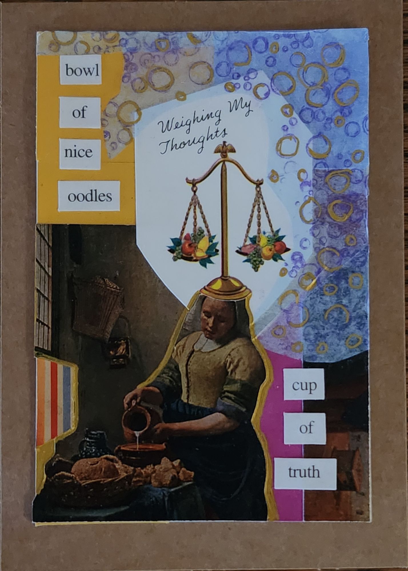 To start an art card, I pull together a collection of cards and ephemera related to a theme or style I want to explore. Gather tools, supplies, and a drink at my art board. Set my phone aside, and pick up an exacto knife. Then, I sit down, quiet down, and begin to make meaning out of the materials in front of me. I’m nowhere near my computer or journal, but making an art card now and then is part and parcel with my writing process.