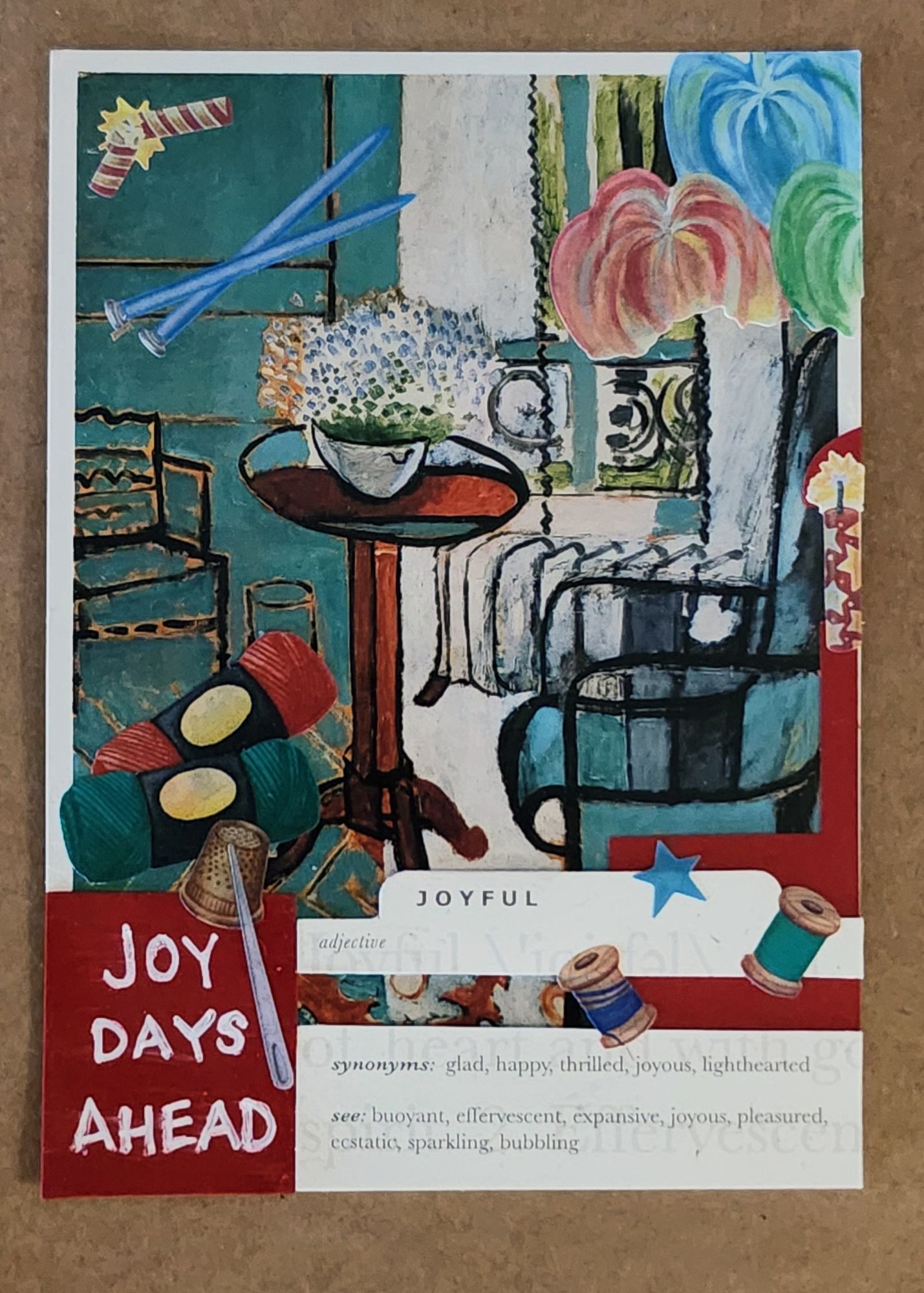 A: The “All happiness this day” was one of the hardest for me to cut into – the postcard was from the 1920’s, and was the main card I received that had writing on it – it had already gone through the mail. The final collage it’s in makes my heart happiest. The collage on the existing postcard, with the line “home away from home” feels most aligned to when I was creating it – in a cabin at a state park, celebrating my 5th wedding anniversary with my spouse, crafting by lantern-light.