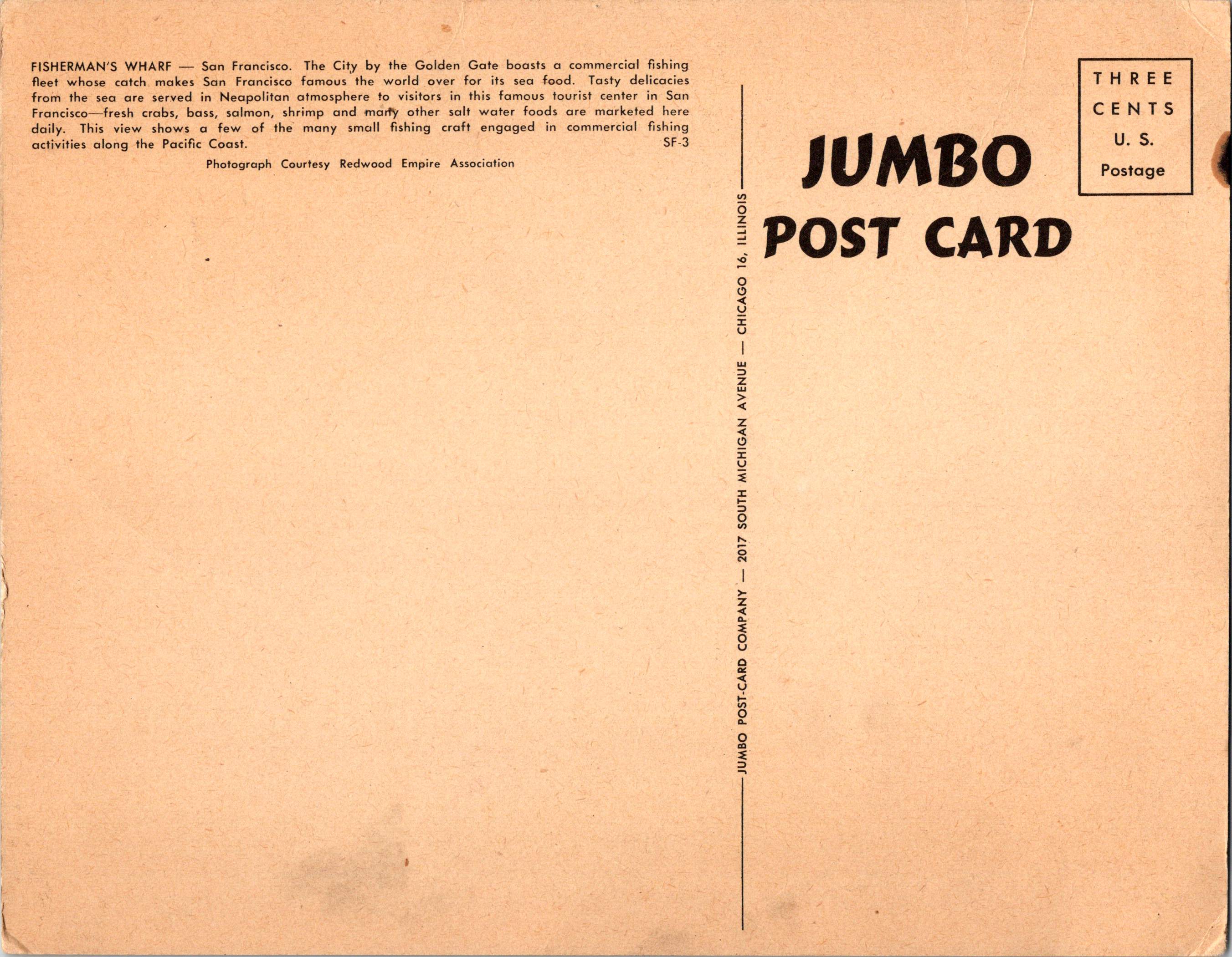 The decision to produce these postcards in a “jumbo” 6×9 inch format was likely a strategic one. Larger than standard postcards, these jumbo versions allowed for more detail and visual impact, making them stand out in souvenir shops and newsstands. The bigger size also aligned with the grandiose, larger-than-life image that San Francisco sought to project to visitors.