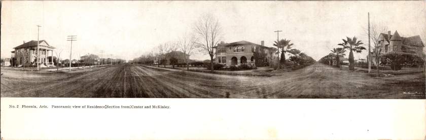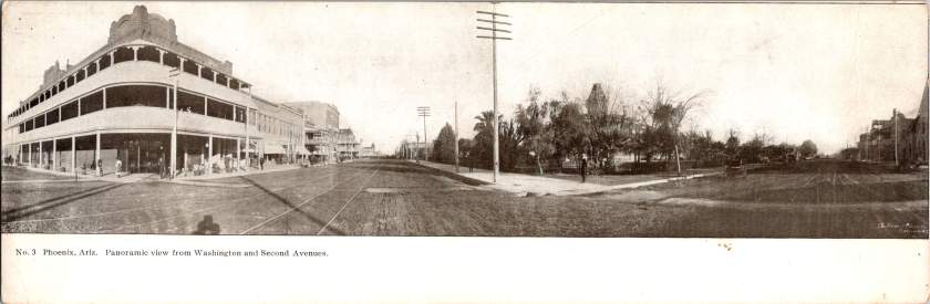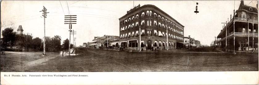 The fourth panorama captures Phoenix’s financial center. A four-story brick building with numerous arched windows dominates the scene. This building houses the Phoenix National Bank with law offices above, very likely belonging to Joseph H. Kibbey, a former Territorial Supreme Court Justice (1889-1893) and Arizona Territorial Governor (1905-1909).