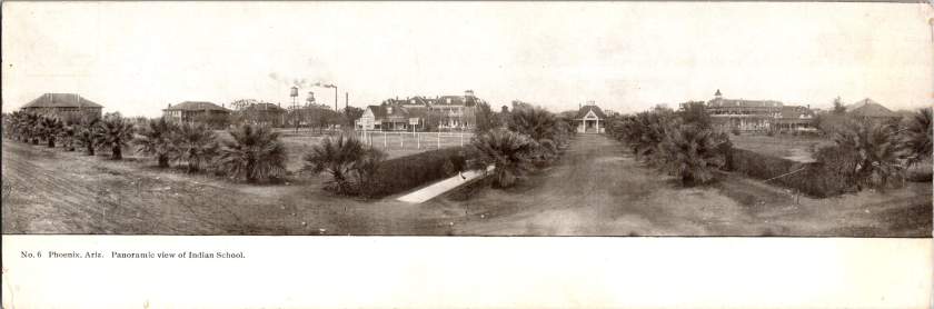 The final panorama depicts the Phoenix Indian School campus with its multiple buildings, some with smoking chimneys, surrounded by palm trees. Established in 1891, this federal boarding school implemented the government’s brutal and coercive Native American assimilation policies. Located on 160 acres north of downtown, the campus featured brick and frame buildings for classrooms, dormitories, workshops, and administration.