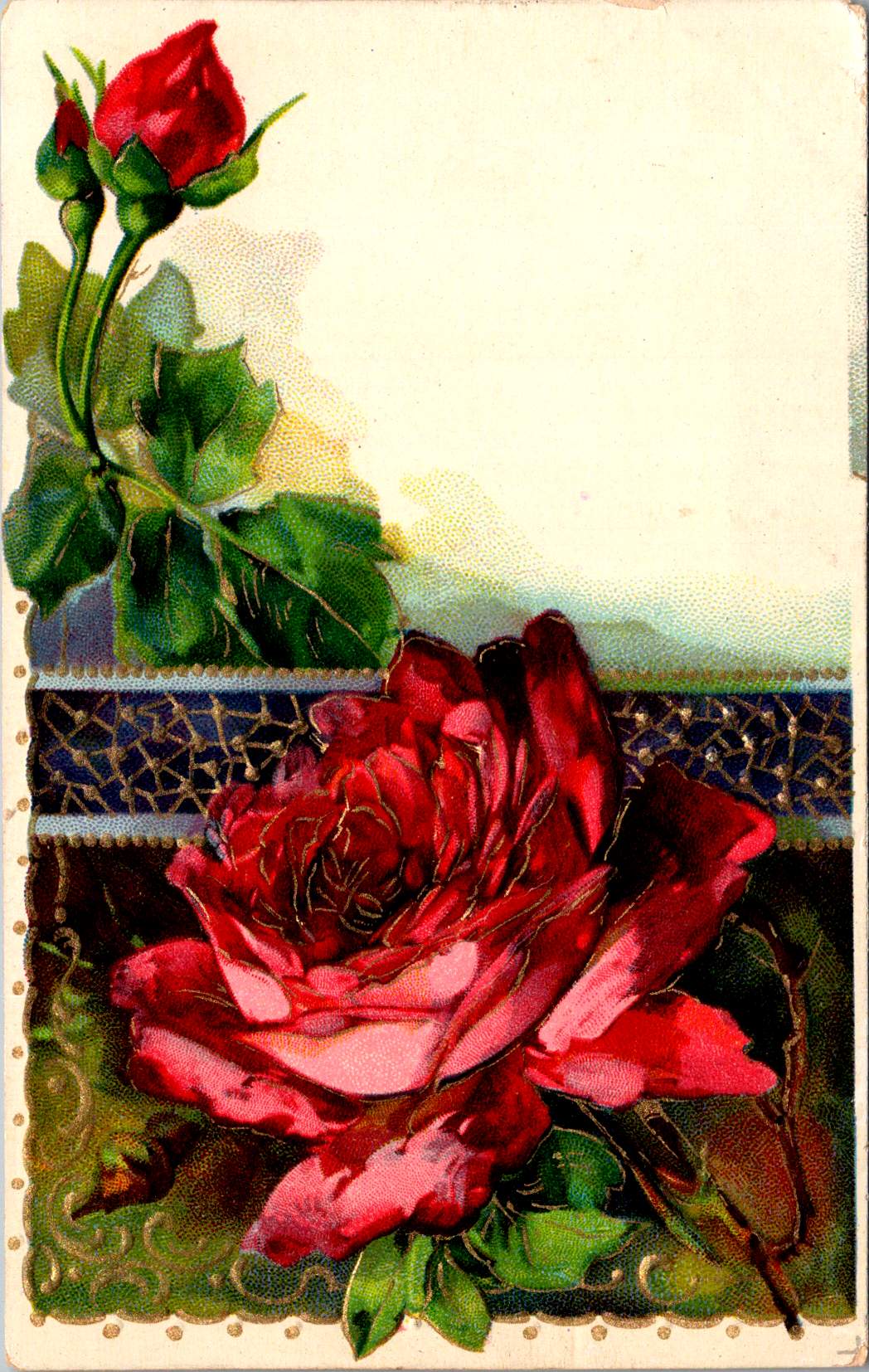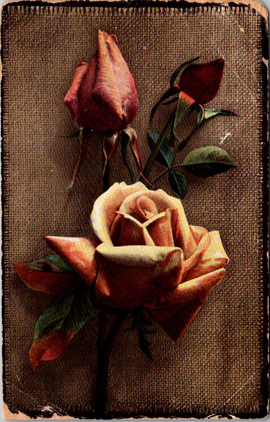 The next group of cards represents another technological leap—an early photograph of light pink roses on a background of actual linen. The physical texture of the rough weave contrasts with the delicate subject matter—an open rose and two buds captured a new reality that only photography could provide. This mixed-media approach demonstrates how artists continued to experiment with both visual and tactile experiences.