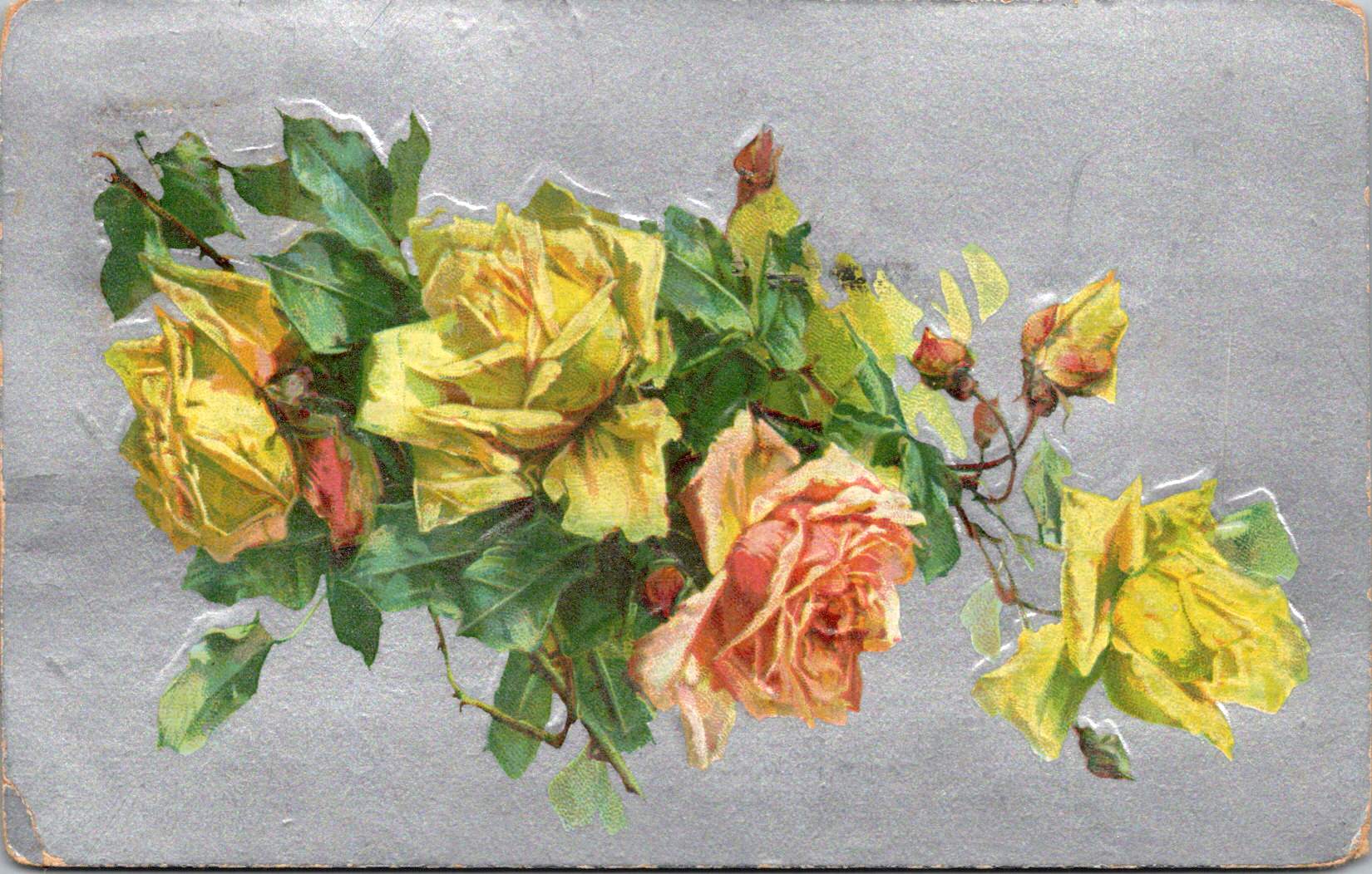 The final featured card offers yellow roses against a silver background, that creates a cooler, more modern luminosity. The yellow blooms—rendered with botanical precision—grow naturally on their stems, emphasizing an organic composition that represents changing sensibilities as the Edwardian era progressed toward what would become Art Deco and modernism.